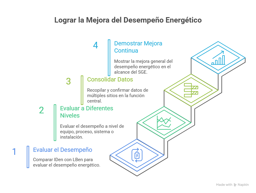 La mejora del desempeño energético se demuestra al evaluar el valor del Indicador de Desempeño Energético IDen en comparación con la línea base energética (LBen) correspondiente. Esto es crucial cuando el consumo absoluto de energía puede verse afectado por factores externos (variables relevantes), pero la eficiencia subyacente del proceso ha mejorado.