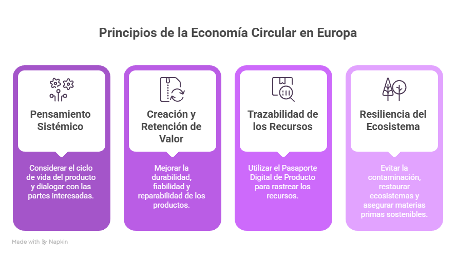 La ISO 59004 establece varios principios fundamentales. La CEN/TS 18333 toma estos principios y los enmarca en la realidad regulatoria europea.
